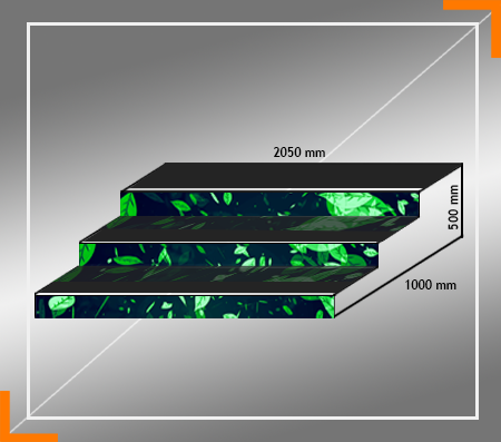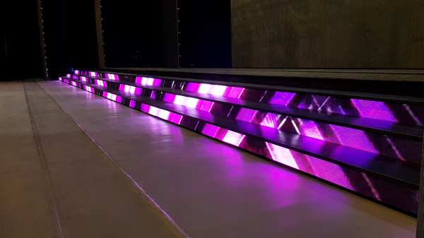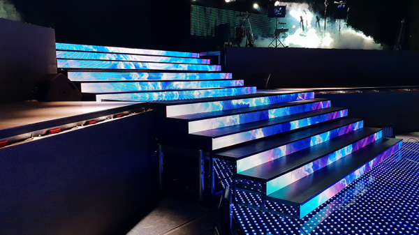 Лестница включает в себя 3 ступеньки с вмонторованными в их торцы светодиодными модулями. Благодаря модульной конструкции светодиодную лестницу можно наращивать как в ширину, так и в высоту (кратно 3 ступенькам). Конструкция имеет собственный каркас и при монтаже на высоту до 1 метра не требует дополнительного сценического оборудования (станков, подъемников и т.п.).